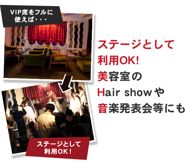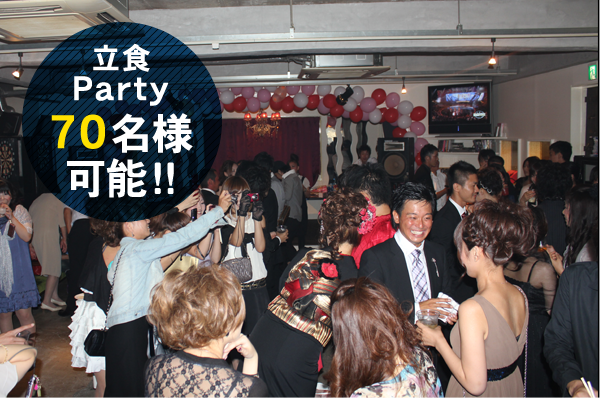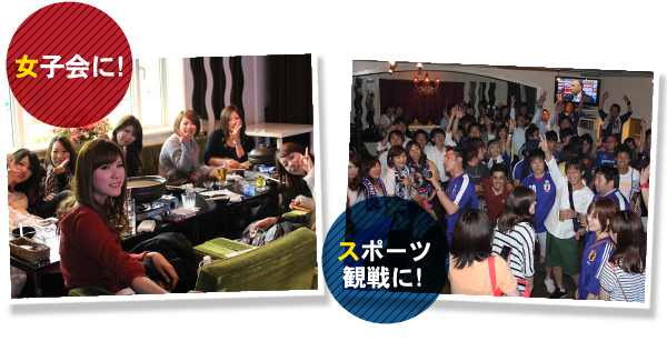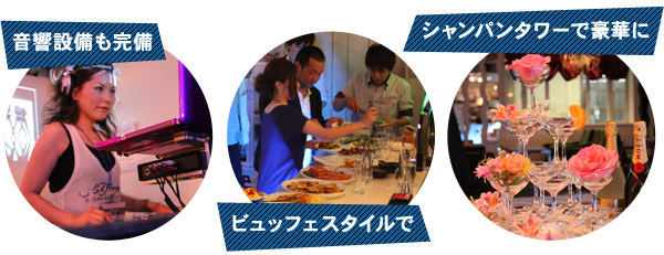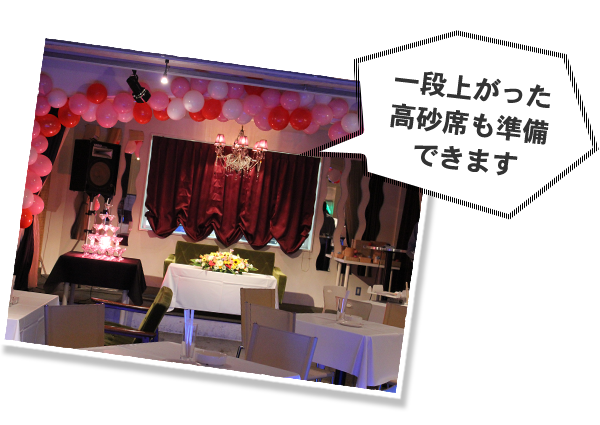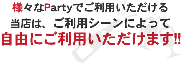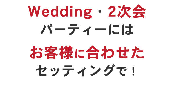 パーティー内容よって、席の配置は自由に変更可能なので、大勢での立食から少し落ち着いた雰囲気での着席のパーティーまでご要望に合わせてお席をセッティングします。